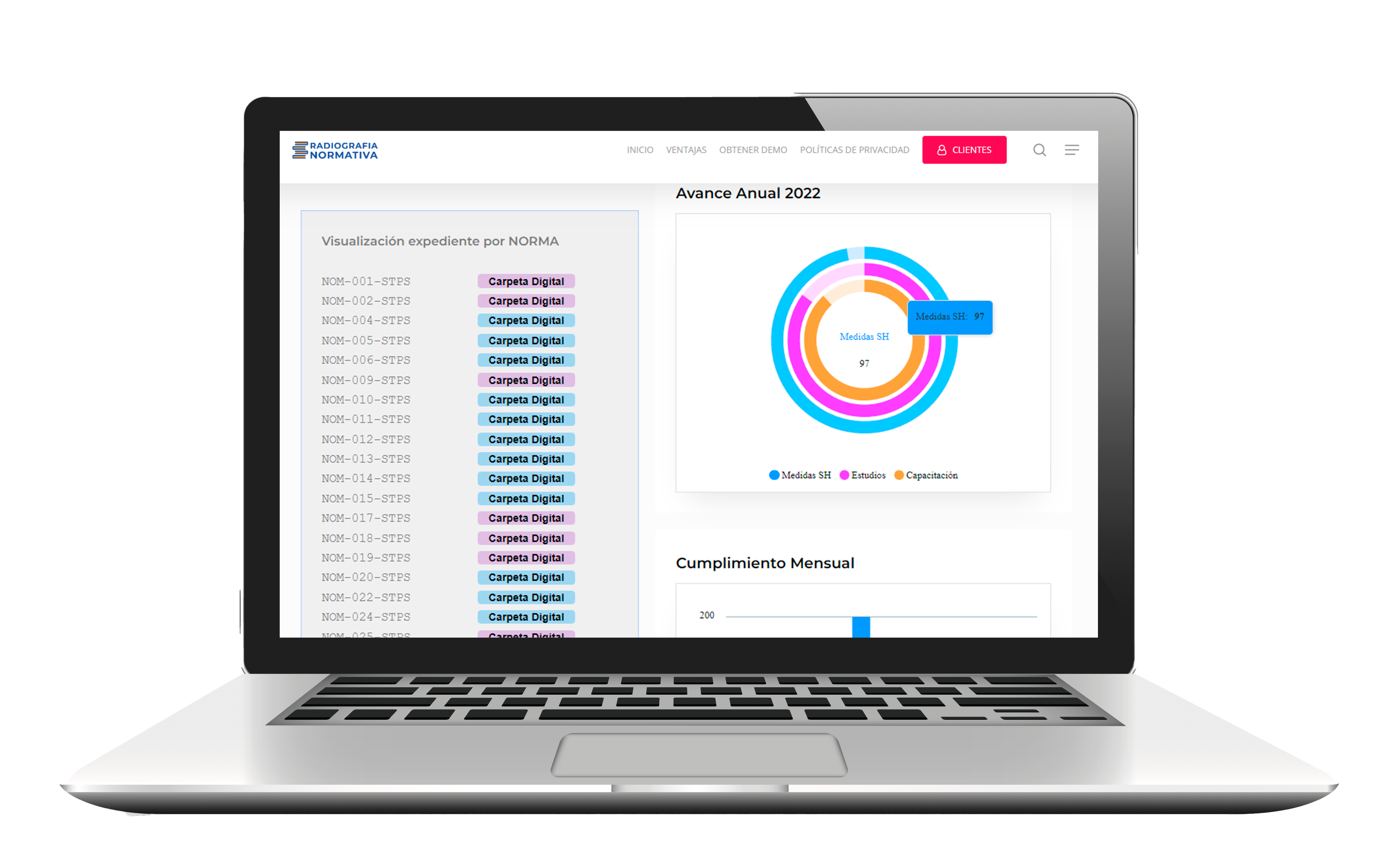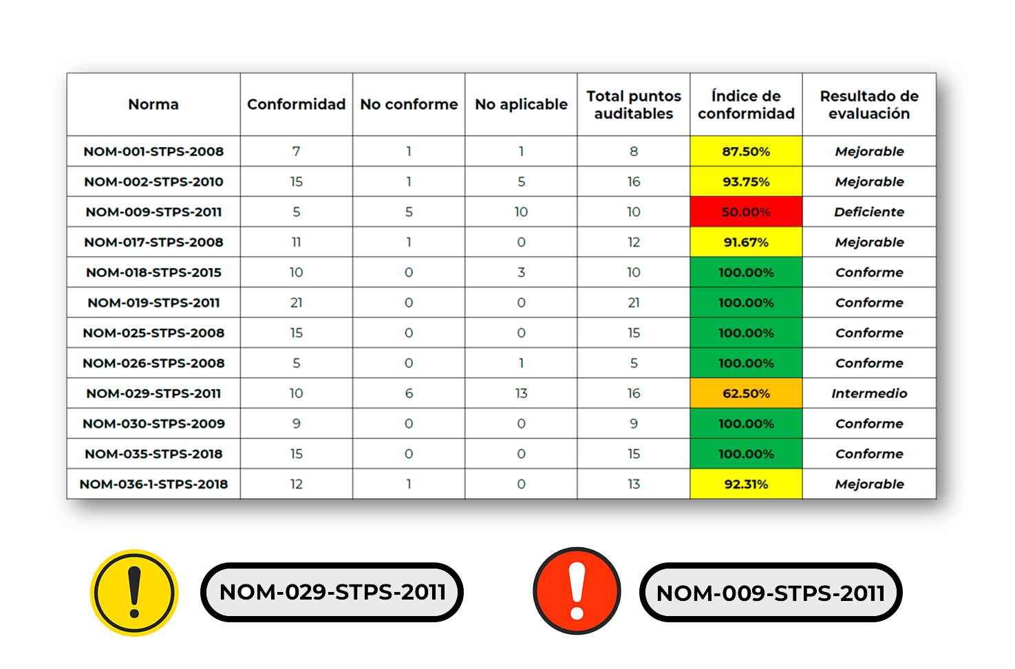 Podrás obtener el nivel de cumplimiento actual de cada norma aplicable en tu centro de trabajo, para determinar las áreas de oportunidad al momento de consultar.